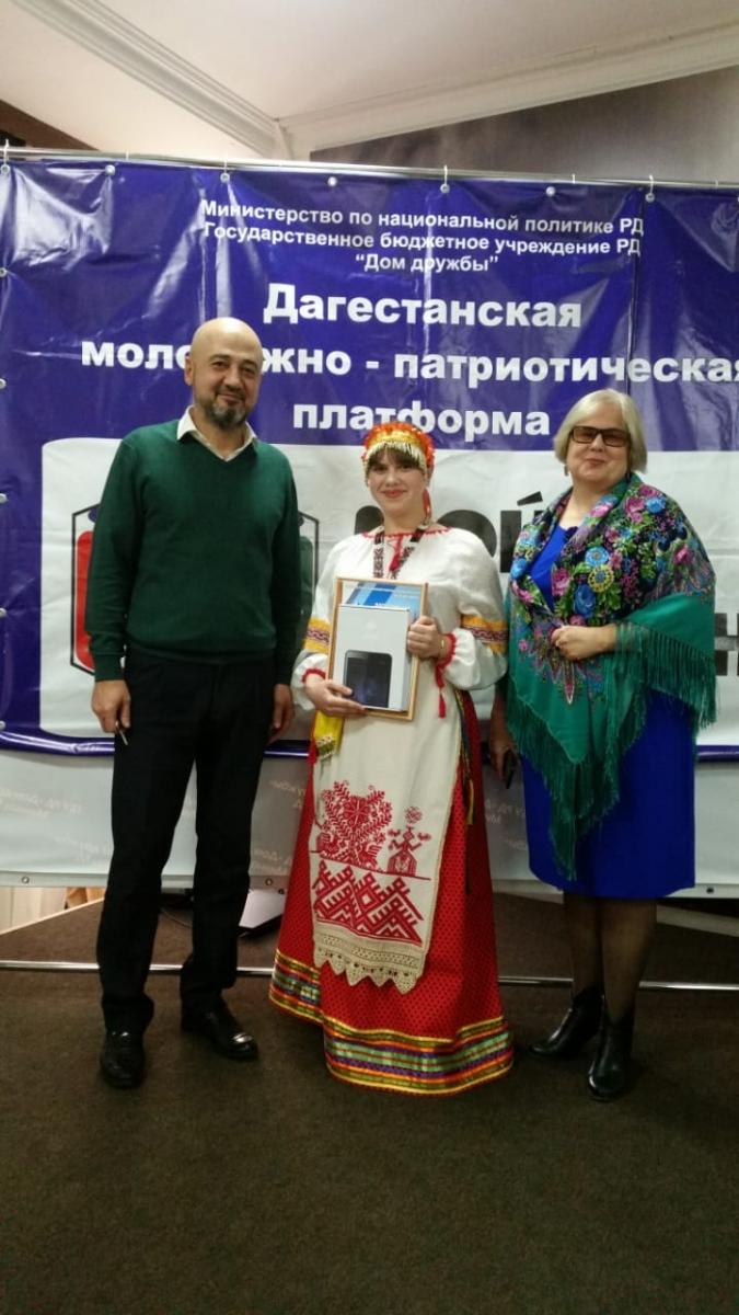 Маргарита награждена Дипломом 2-й степени в этапе «Национальный костюм моего края» и планшетом. Благодарностью за участие в конкурсе «Мой Дагестан» отмечена Любовь Александровна Назарова.