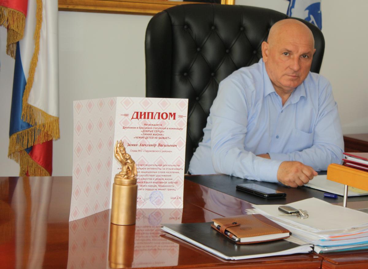 В числе номинантов премии «Добрые руки» был и глава администрации МР «Тарумовский район» РД Александр Васильевич Зимин. За благотворительную деятельность он награжден Дипломом и бронзовой статуэткой во всех трех номинациях.