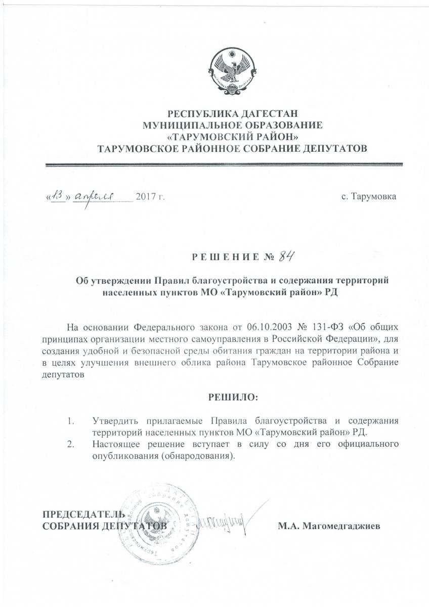 Решение № 84 об Утверждении Правил благоустройства и содержаний территорий населённых пунктов Тарумовского района