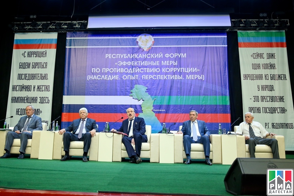 В среду, 1 июля, в Доме дружбы в Махачкале состоялся форум «Эффективные меры по противодействию коррупции». В мероприятии приняли участие Председатель Народного Собрания РД Хизри Шихсаидов, Председатель Правительства РД Абдусамад Гамидов, Руководитель Администрации Главы и Правительства РД Рамазан Алиев, председатель Общественной палаты Дагестана Гамзат Гамзатов, депутаты парламента, полномочные представители Главы республики в территориальных округах, руководители министерств и ведомств, представители территориальных органов федеральных органов исполнительной власти, руководители республиканских организаций, учреждений, промышленных предприятий, бизнес-сообществ и строительных компаний, НИИ, вузов и ссузов, образовательных и дошкольных учреждений, представители общественных и молодежных организаций, муниципальных районов и городских округов, средств массовой информации.