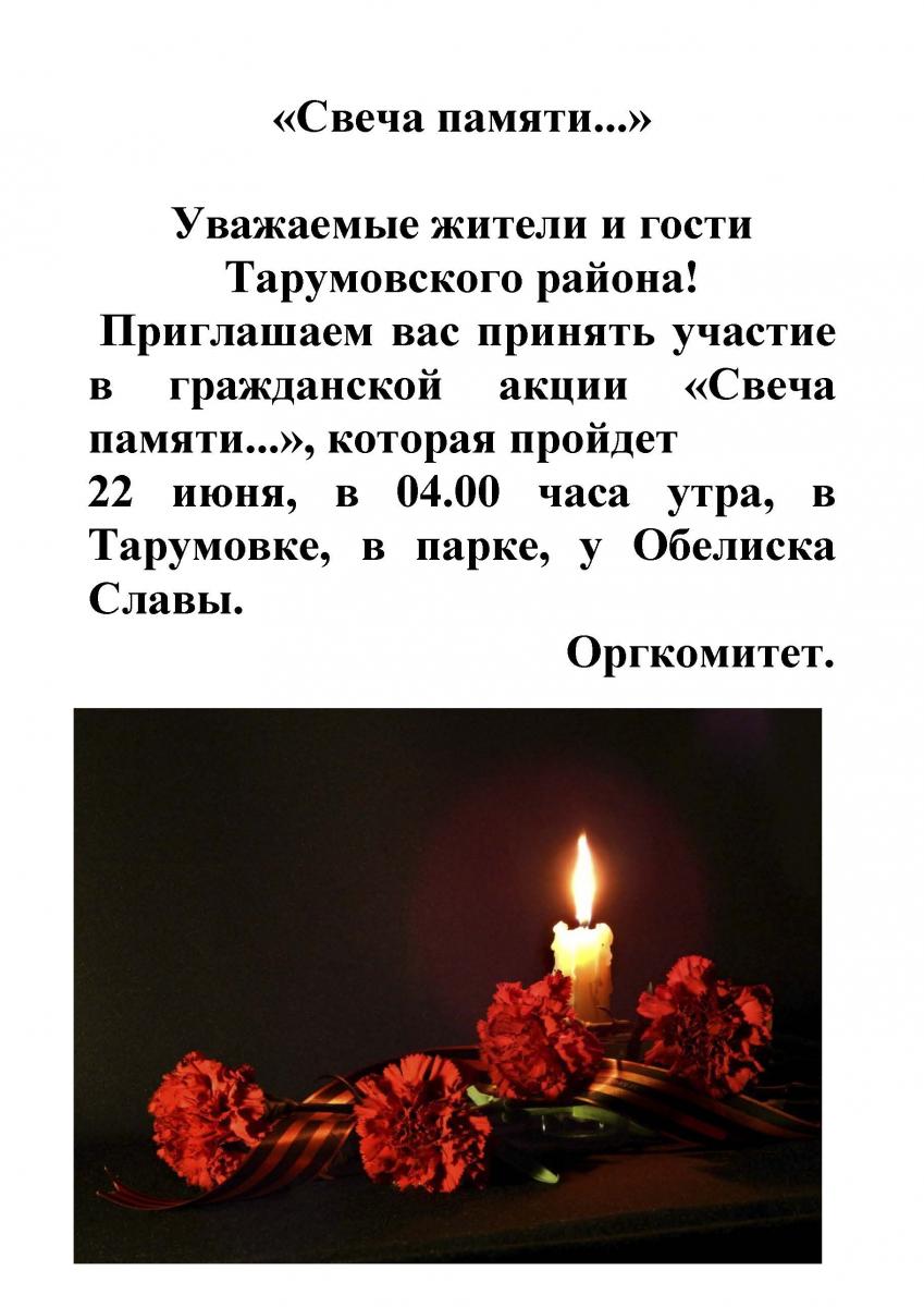 Приглашаем вас принять участие в гражданской акции «Свеча памяти...» и митиинге, которые пройдут 22 июня, в 04.00 часа утра, в Тарумовке, в парке, у Обелиска Славы.