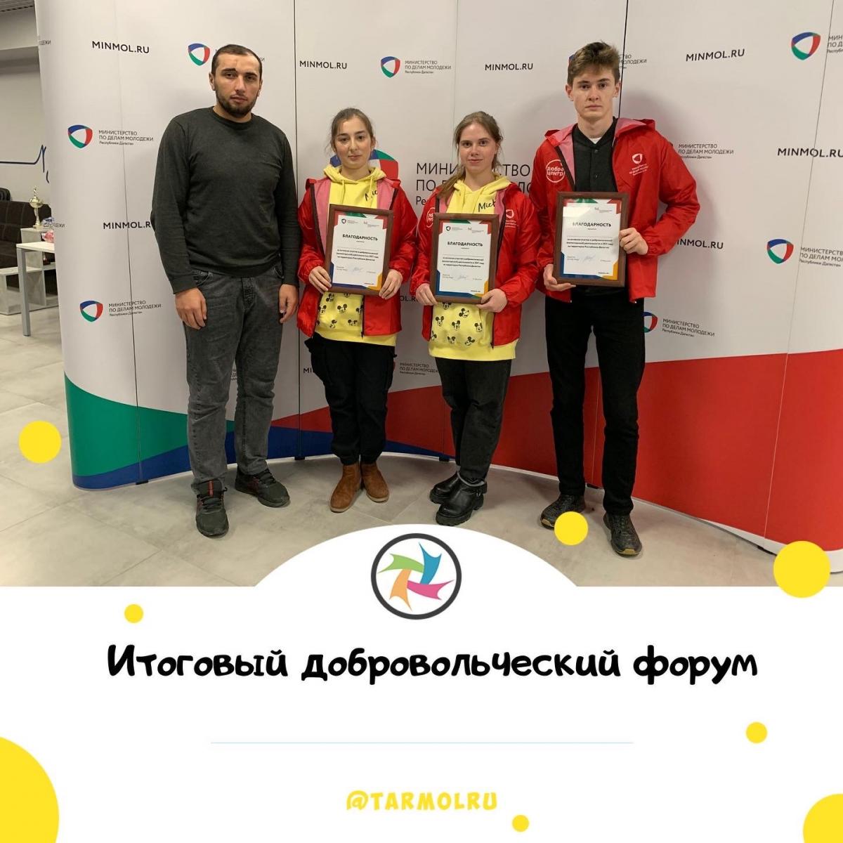 На форуме были подведены итоги рейтинга активности районов и городов в добровольческой деятельности. По итогам рейтинга Тарумовский район занял почетное 3-е место, а наиболее активные волонтеры были награждены Благодарственными письмами от Минмолодежи и фирменной атрибутикой.