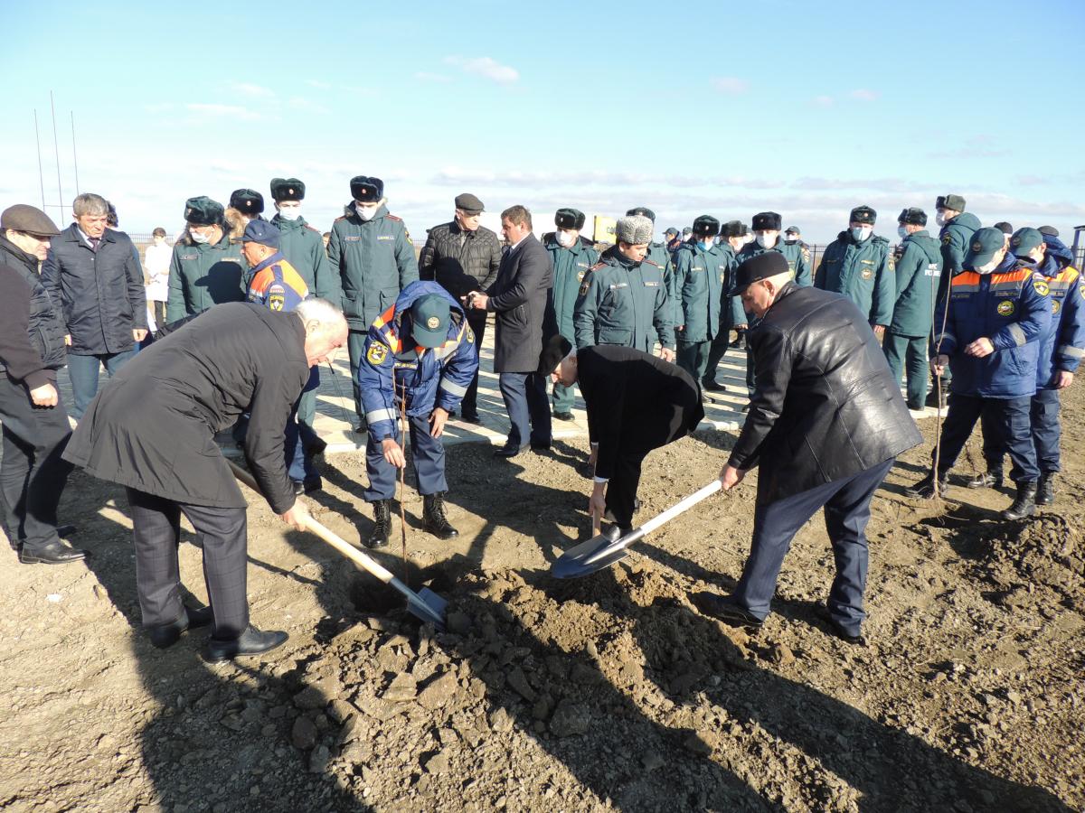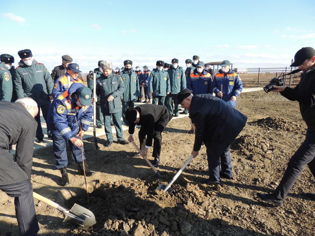 Церемонию открытия Тарумовского Поисково-спасательного подразделения предваряла посадка деревьев в память трагически погибшего Героя России, Главы МЧС РФ Евгения Зиничева, участие в которой приняли официальные лица.